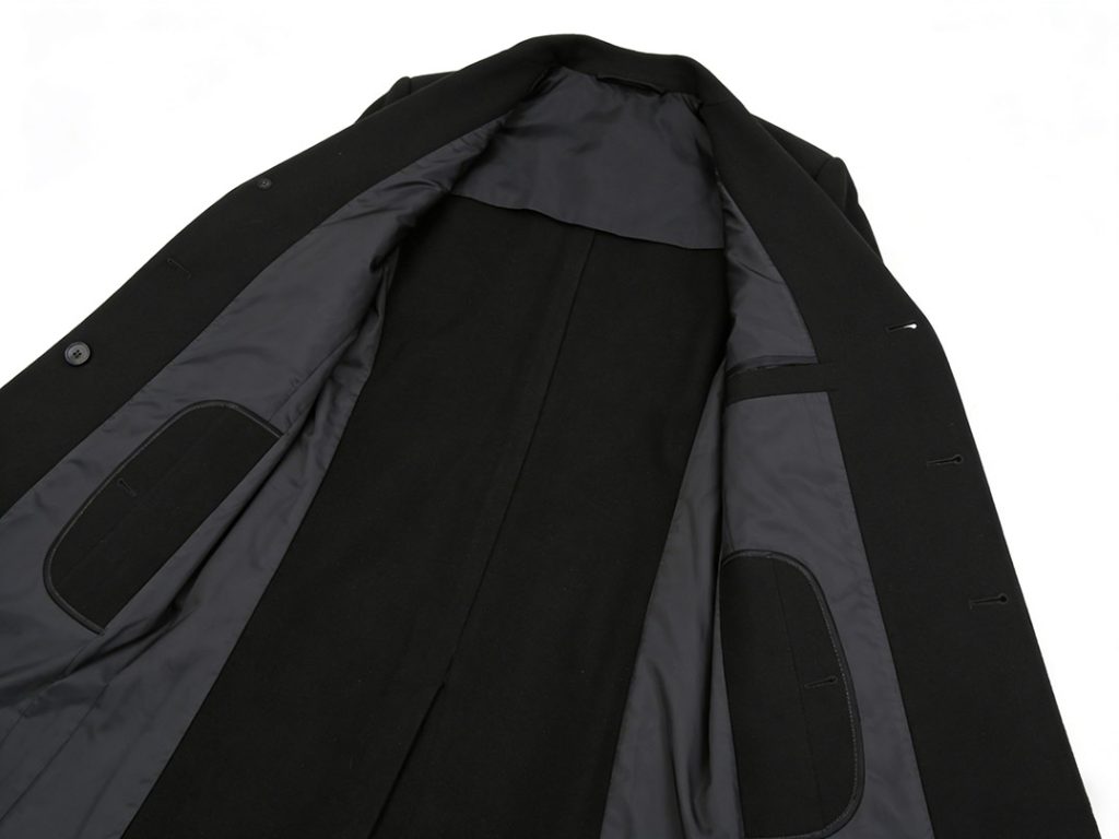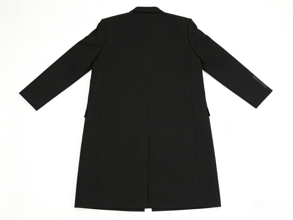 For practicality, the coat includes two front piped or patch pockets and a left chest pocket for a handkerchief, adhering to the classic structure of formal overcoats. The cuffs are designed with slits and decorative tabs, enhancing sophistication and meeting high-end formal outerwear standards.